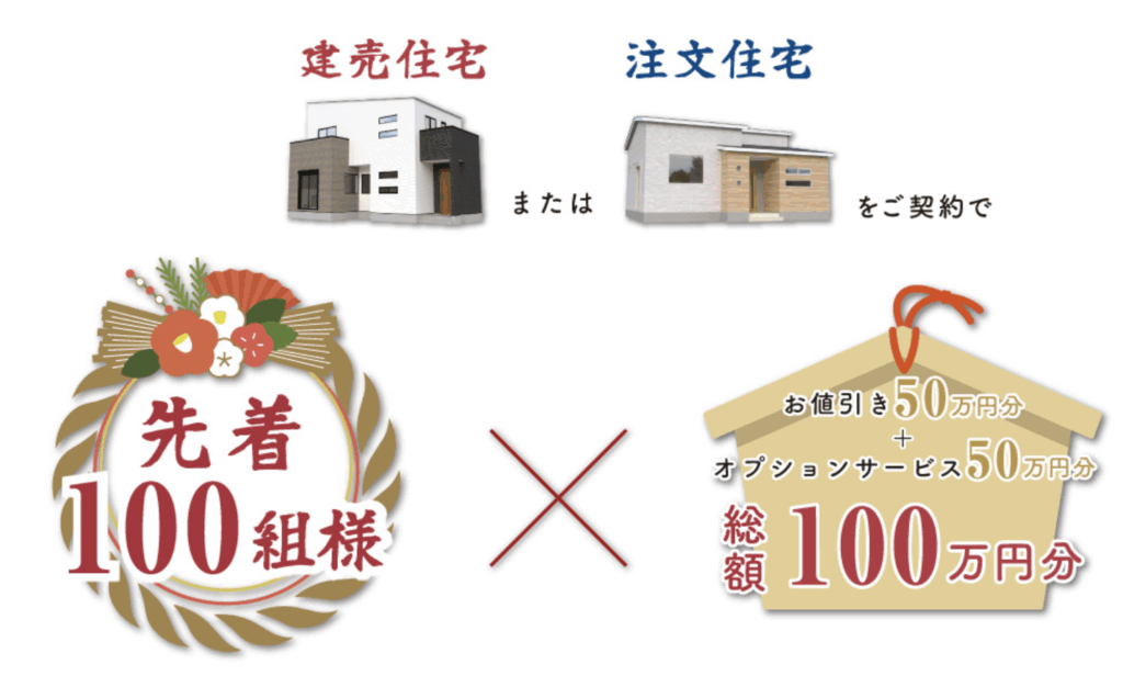 キャンペーン期間中に、「横尾材木店」の建売住宅または注文住宅をご成約いただいた100組様に1邸につき100万円分還元(物件価格から50万円お値引き+オプション50万円分サービス)