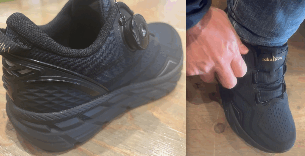 ダイヤルを回すだけで足にぴったりとフィットさせることができ、脱ぐときはダイヤルを引くだけで緩めることができます。