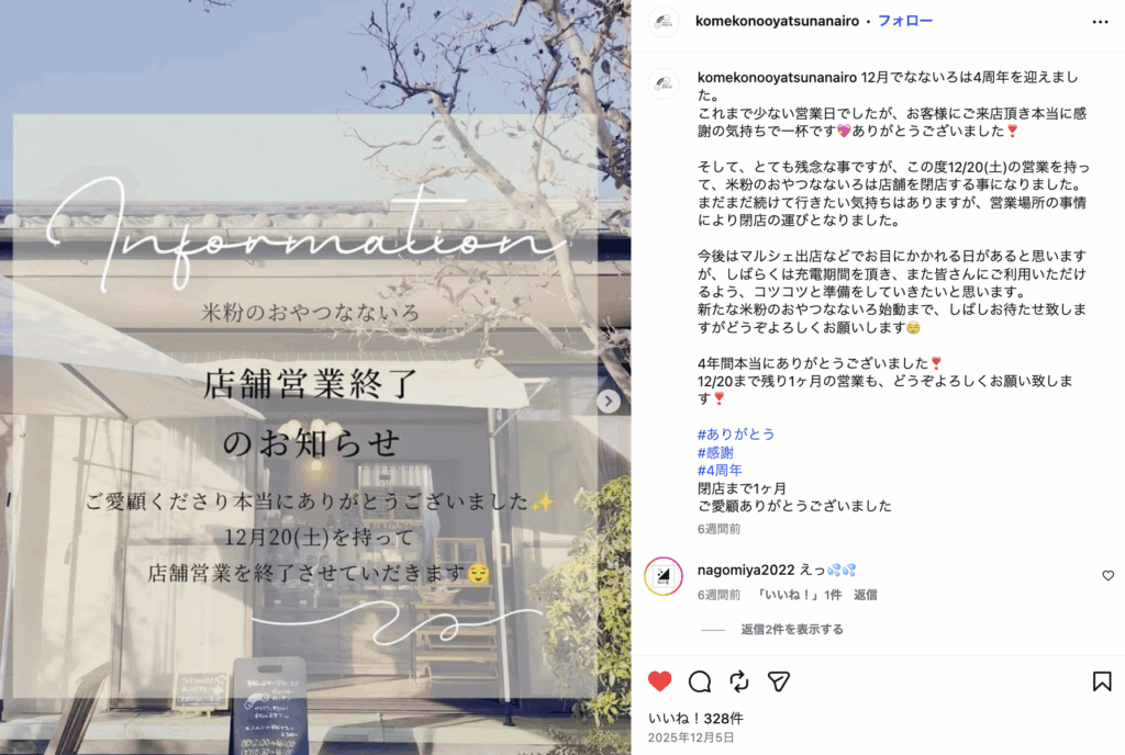 「米粉のおやつ なないろ」は、2021年12月にオープンした「グルテンフリー・ヴィーガン中心の米粉のおやつ」などを提供するお店でした。