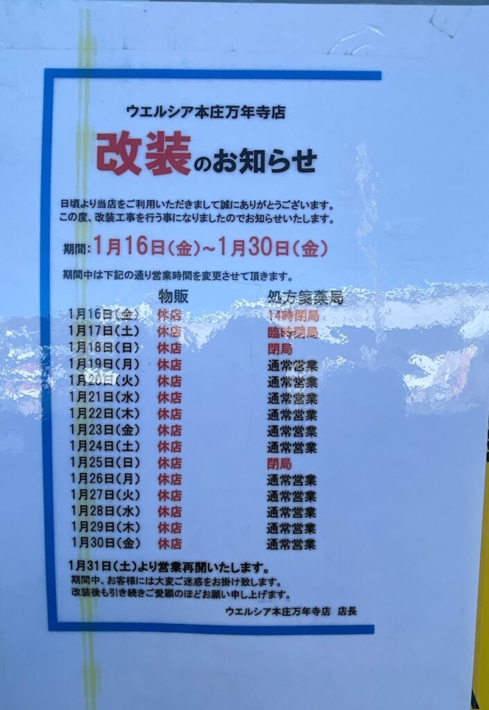 本庄市万年寺にある「ウエルシア本庄万年寺店」が改装のため臨時休業しています。