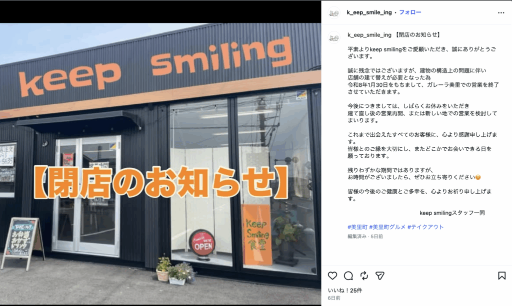 美里町関にある「Keep Smiling 食堂」が閉店するみたいです。