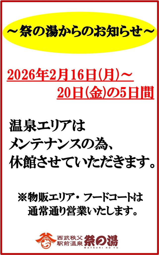 秩父市野坂町にある「西武秩父駅前温泉 祭の湯」がメンテナンス作業のため一時休館するみたいです。