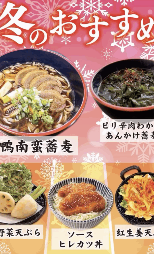 「あったか冬メニュー」は、旨みたっぷりの「鴨南蛮蕎麦」やピリッとした辛さがクセになる「ピリ辛肉わかめ あんかけ蕎麦」など『体の芯から温まるお蕎麦』から、旬の冬野菜を使った「冬野菜天ぷら」「紅生姜天ぷら」、 ボリューム満点の「ソースヒレカツ丼」など幅広い世代から愛される内容となっています😸