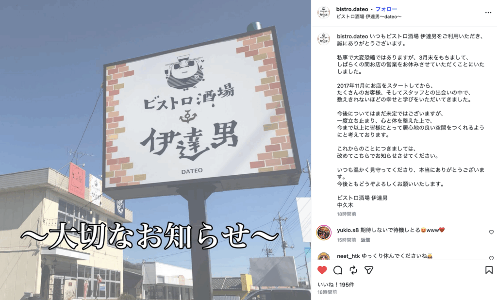 寄居町寄居にある「ビストロ酒場 伊達男」が休業するみたいです。