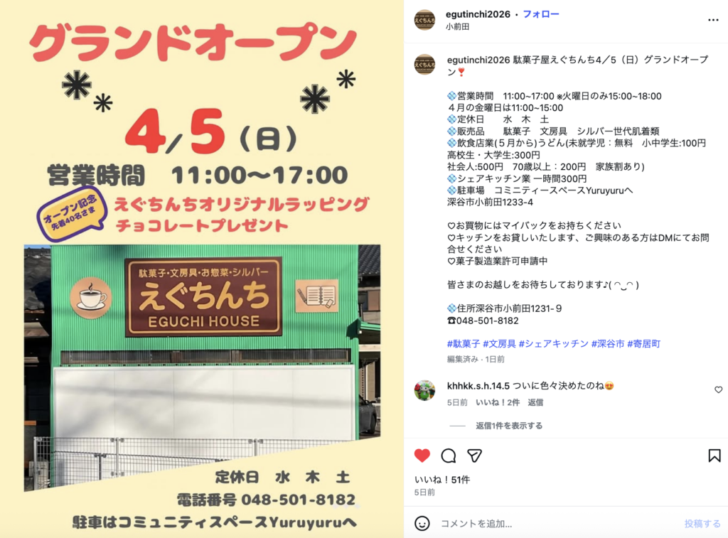 深谷市小前田に「駄菓子屋えぐちんち」がオープンするみたいです。