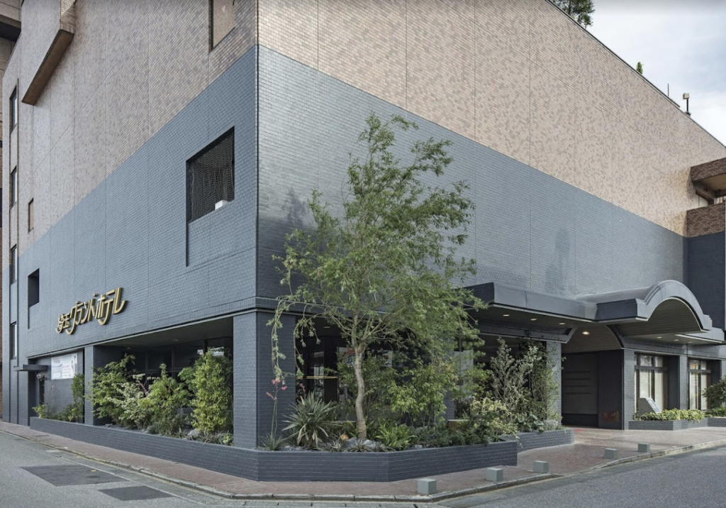 グレーを基調としたタイル貼りと中から見えるアートグリーンの落ち着いた雰囲気が特徴的✨