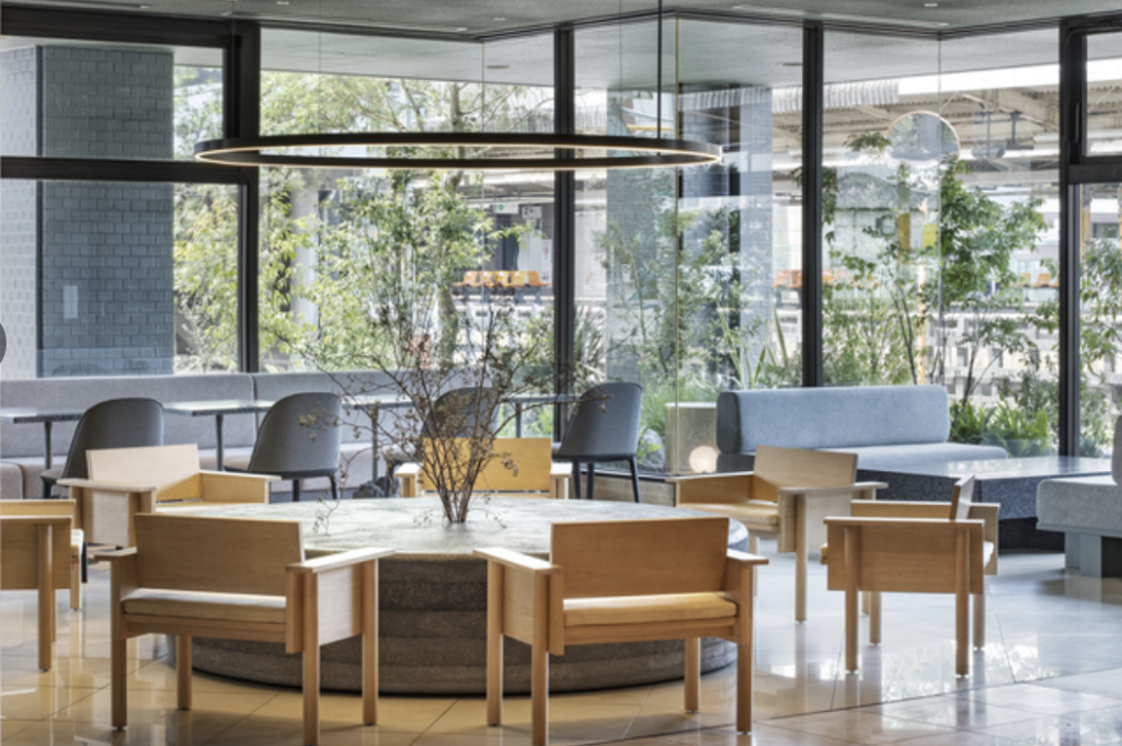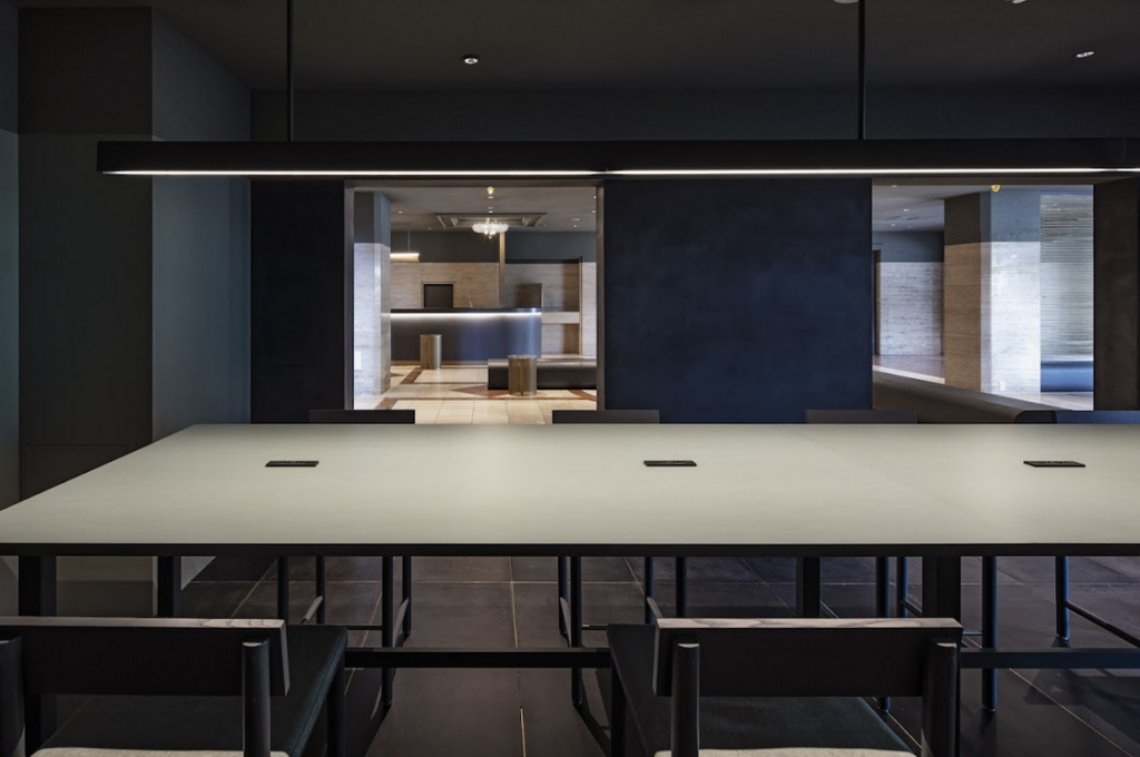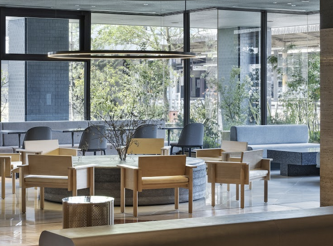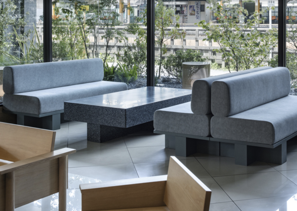 また、「人工的なモノと自然にある石との中間のような存在」を目指し、ラウンジに設置したテーブルを中心として内外が一体となった庭園のような空間を作りました。