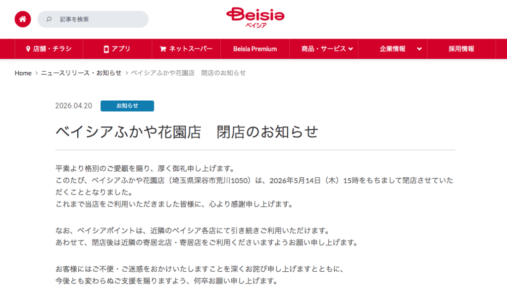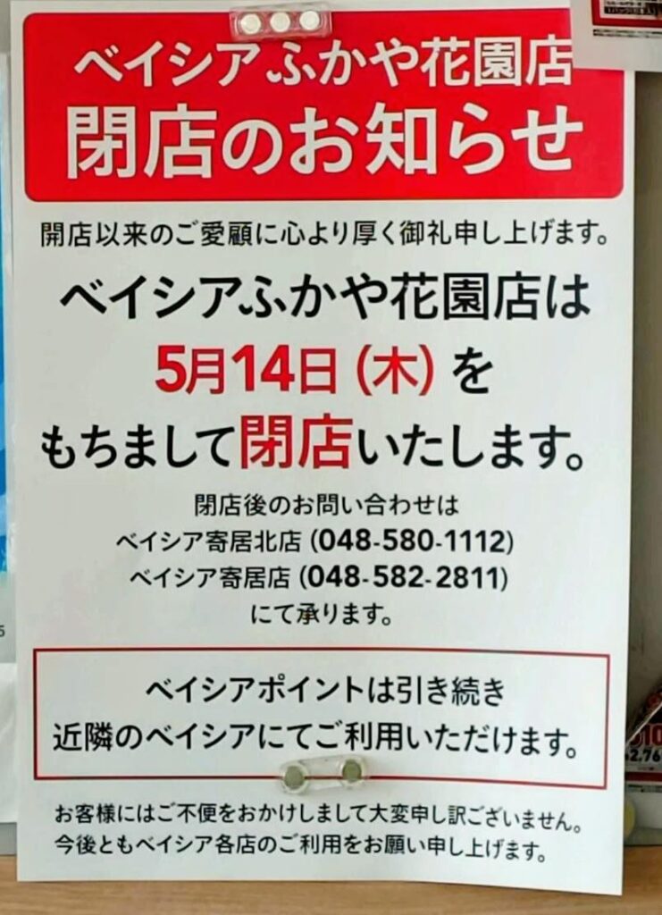 深谷市荒川にある「ベイシアふかや花園店」が閉店するみたいです。