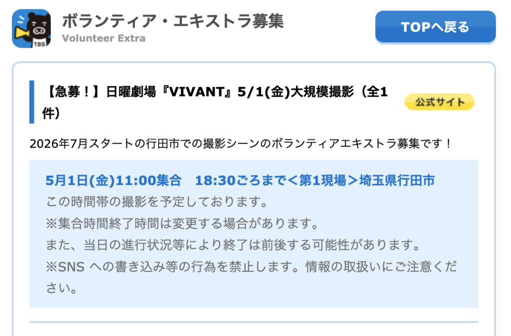 行田市内で行われるTBS系ドラマ「VIVANT」のエキストラ募集が再開したみたいです。