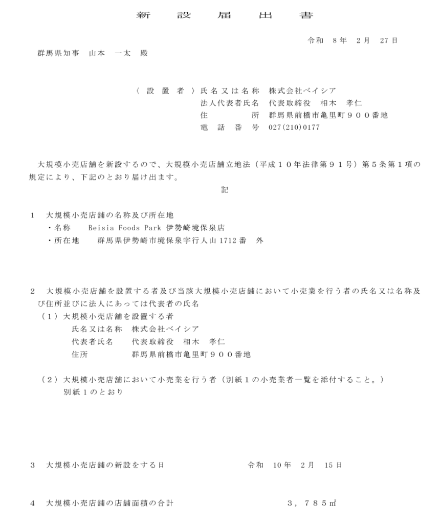 「Beisia Foods Park 伊勢崎境保泉店」新設届出書(1P目)↓