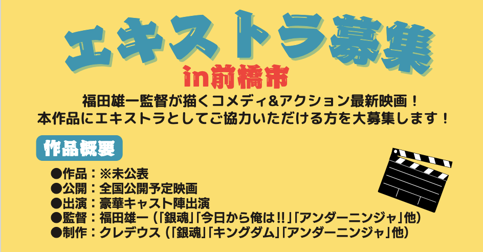 前橋市内で福田雄一監督最新映画の撮影が行われるみたい。エキストラ募集中。